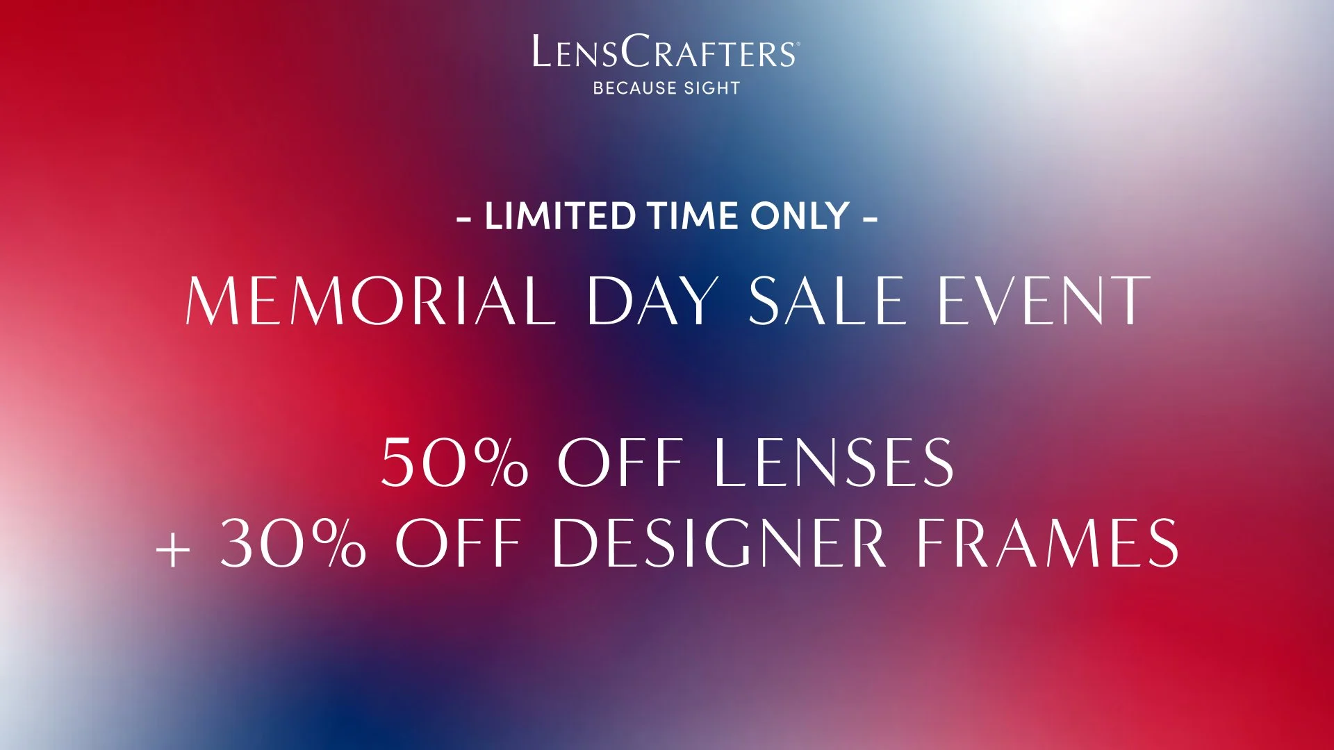 LensCrafters - Memorial Day Sale Friday, May 15, 2026 9:00 AM 09:00 Monday, May 25, 2026 10:00 AM 10:00 Google Calendar ICS Celebrate Memorial Day in style! 50% off lenses + 30% off designer frames at LensCrafters for a limited time only. Learn more